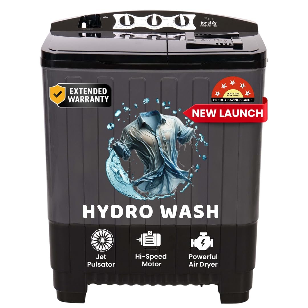 Ionstar 7.5 Kg Semi Automatic Washing Machine – 5 Star Rated – 2025 – Top Load – Jet Pulsator – Magic Filter – Special Air Dryer – Buzzer – Wheels – Powerful Copper Motor – 1500 RPM (STAR75-AQUA-G)