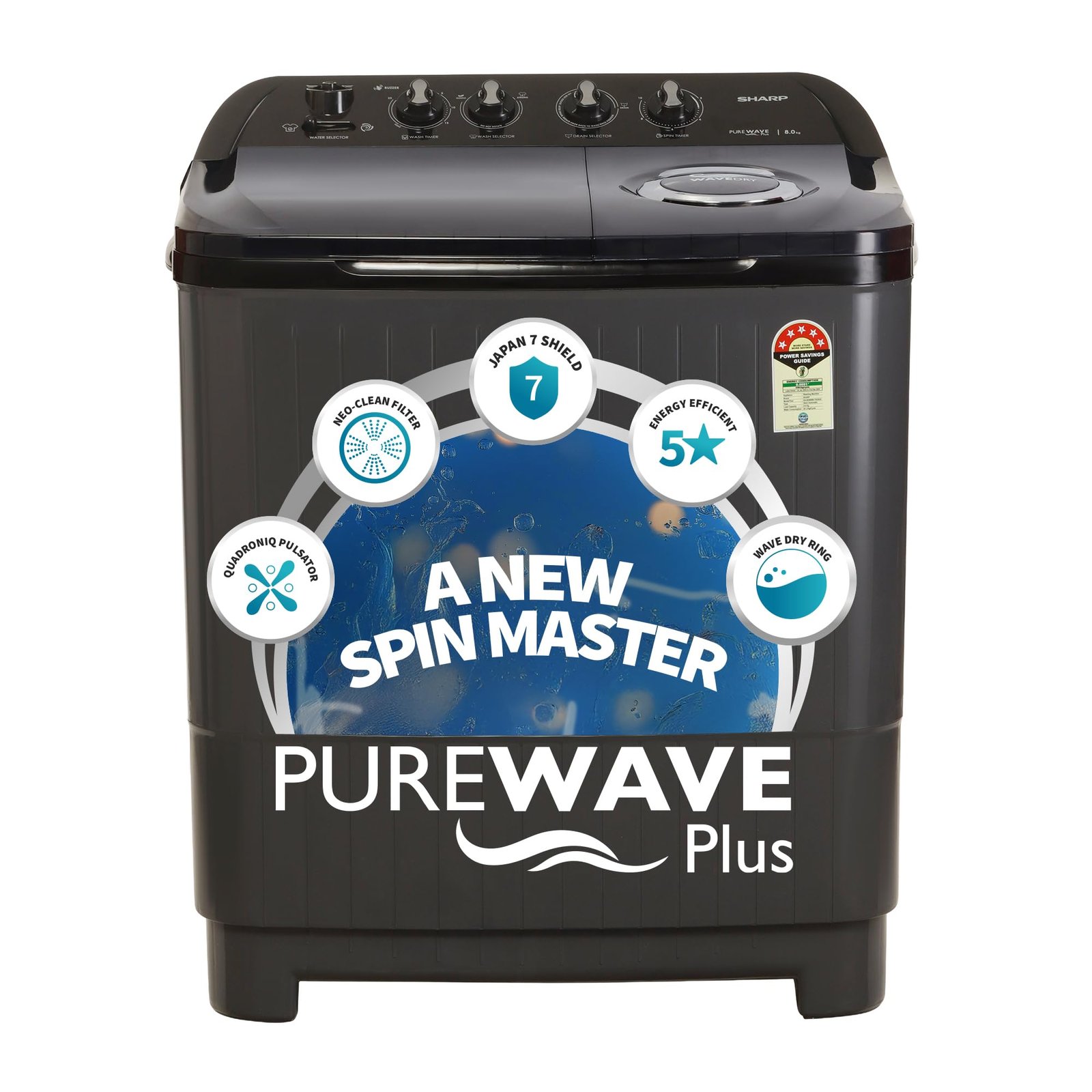 SHARP 8.0 kg, 5 star Semi-Automatic Top Loading Washing Machine with Quadroniq Pulsator, Wave Dry Ring, 300 RPM (ES-SD80NB-TS, Steel Grey, Pure Wave+)