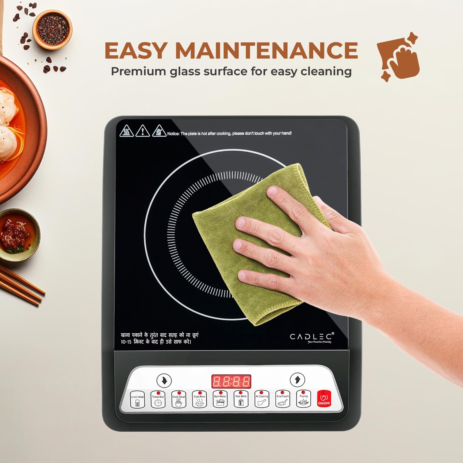 • Cadlec CookMate 2000W Induction Cooktop with Crystal Glass | 7 Cooking Modes, Auto Shut-Off, Over-Heat Protection, LED Display, BIS Approved, 2-Year Warranty | Black