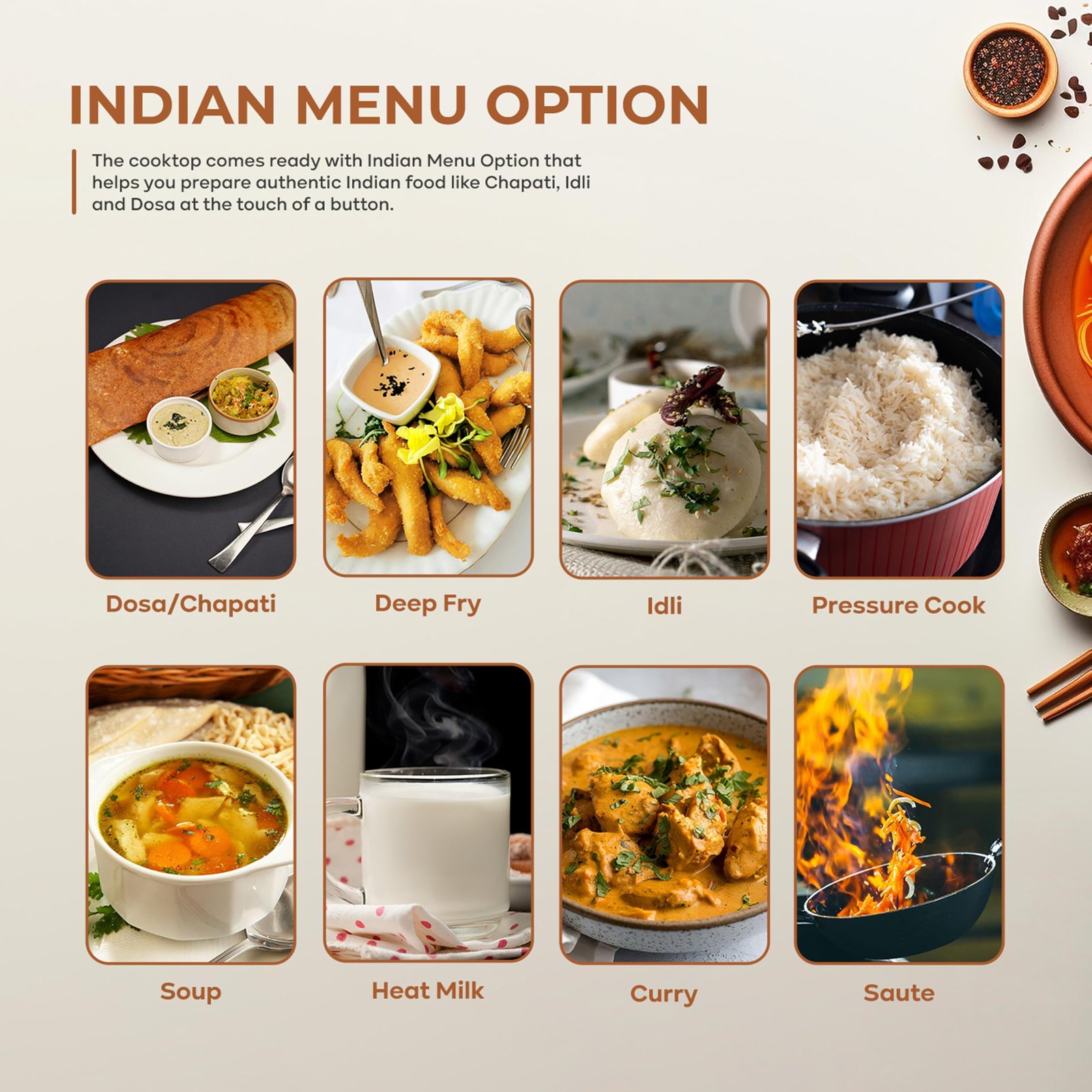 • Smart Preset Cooking Functions: Pre-programmed settings for Indian dishes like Chapati & Dosa, offering quick and easy cooking at the push of a button.