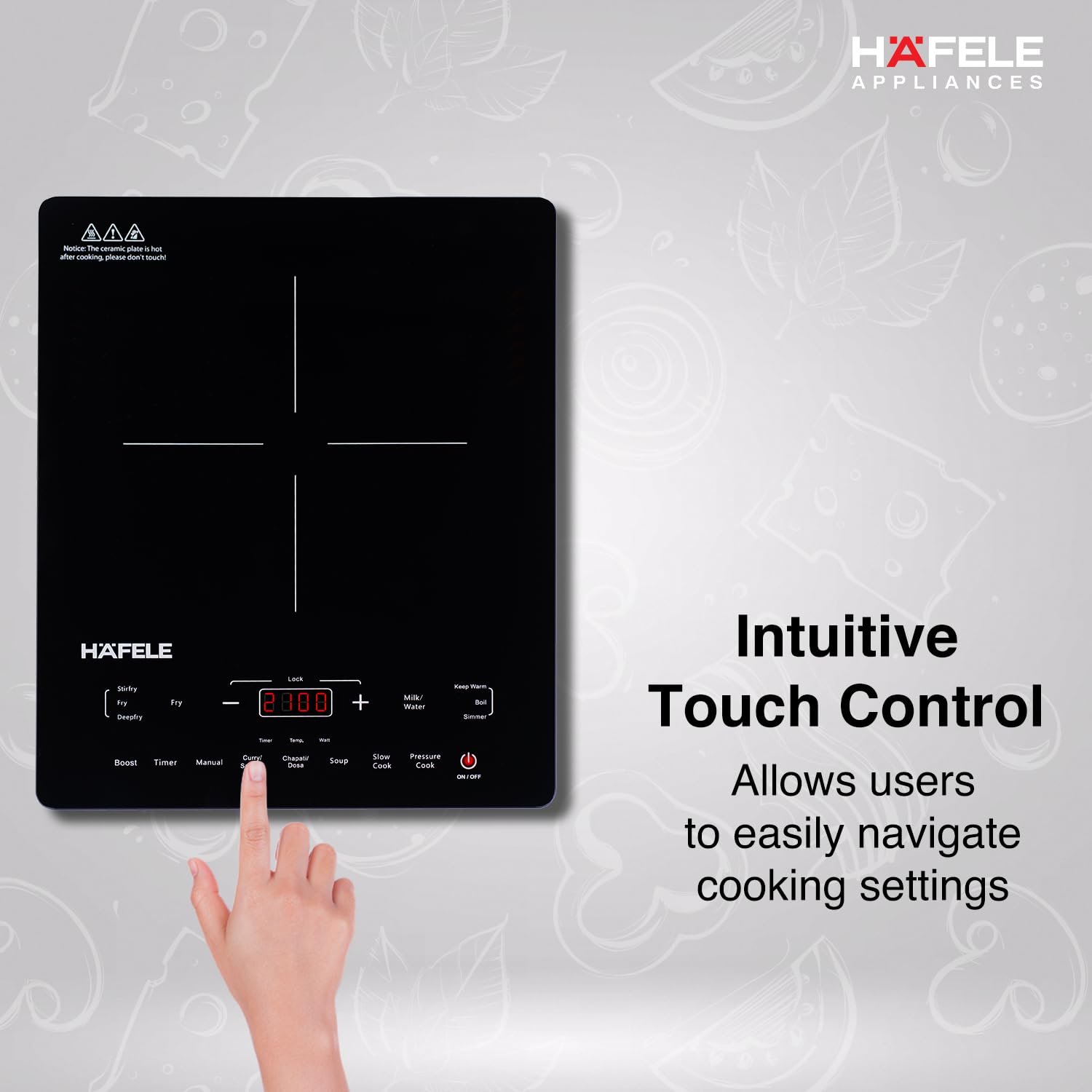 • Hafele Magnechef Induction Cooktop |2100W High Power | Ceramic Glass Plate | Auto Cook Menus | Intuitive Touch Control | 2 Year Warranty | Black