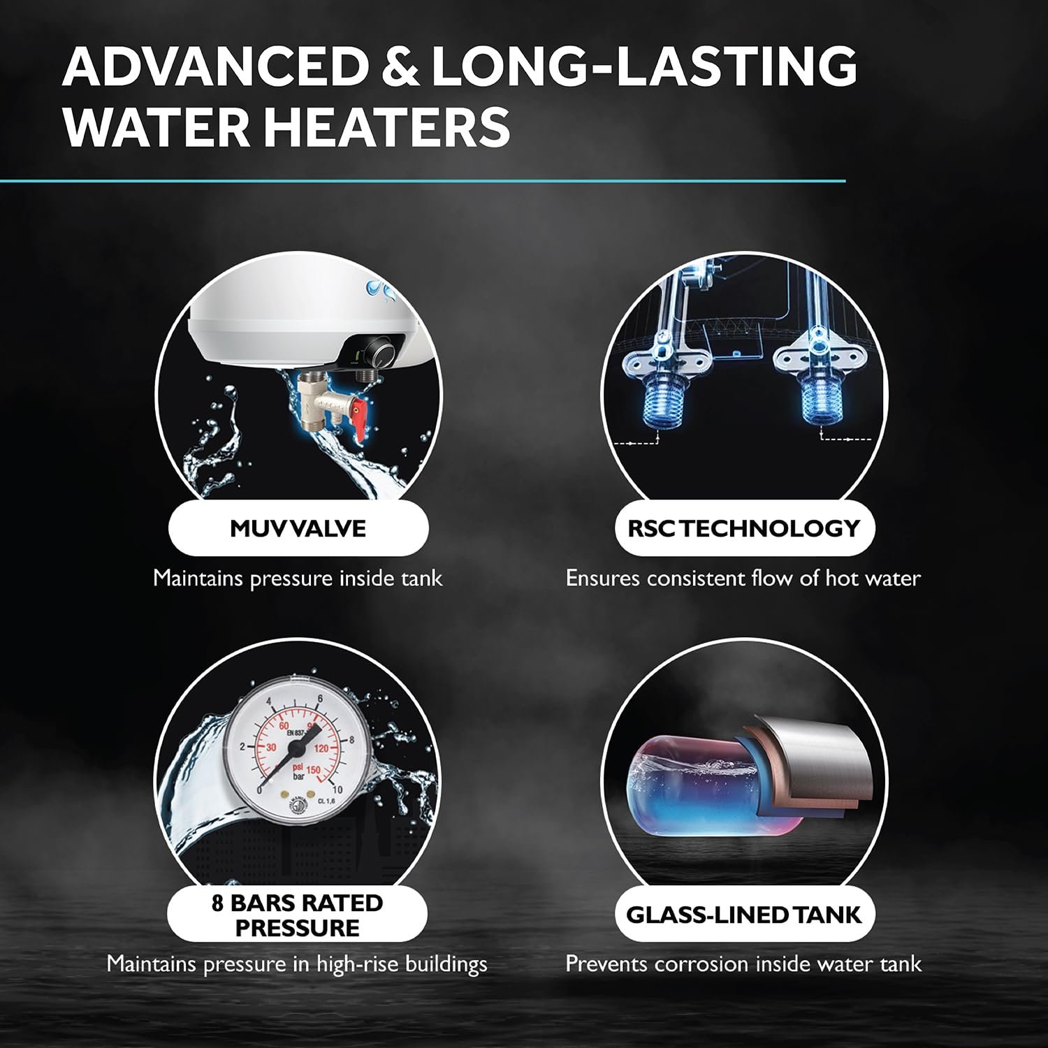 • Made to Last: The glass-lined tank is resistant to corrosion, acids, and bursts. The geyser 10 ltr uses the world-leading full-automated robotic laser tracking welding to make the tank. The tank of 10 litre geyser can withstand pressures up to 8 bar and has undergone an incredible 160000 pressure tests before leaving the factory to ensure that the inner tank is sturdy and durable