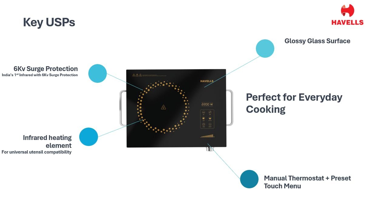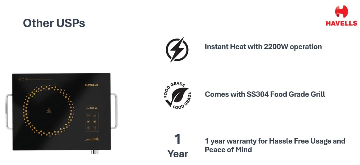 • Havells 2200 Watt Infrared Induction Cooktop Glo TV22-6KV Surge Protection, Sensor Touch,Universal Utansil Compatibility, SS304 Food grade grill