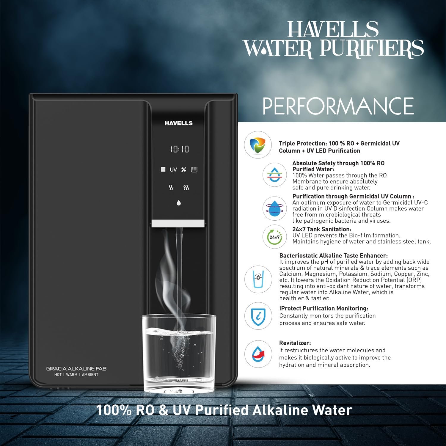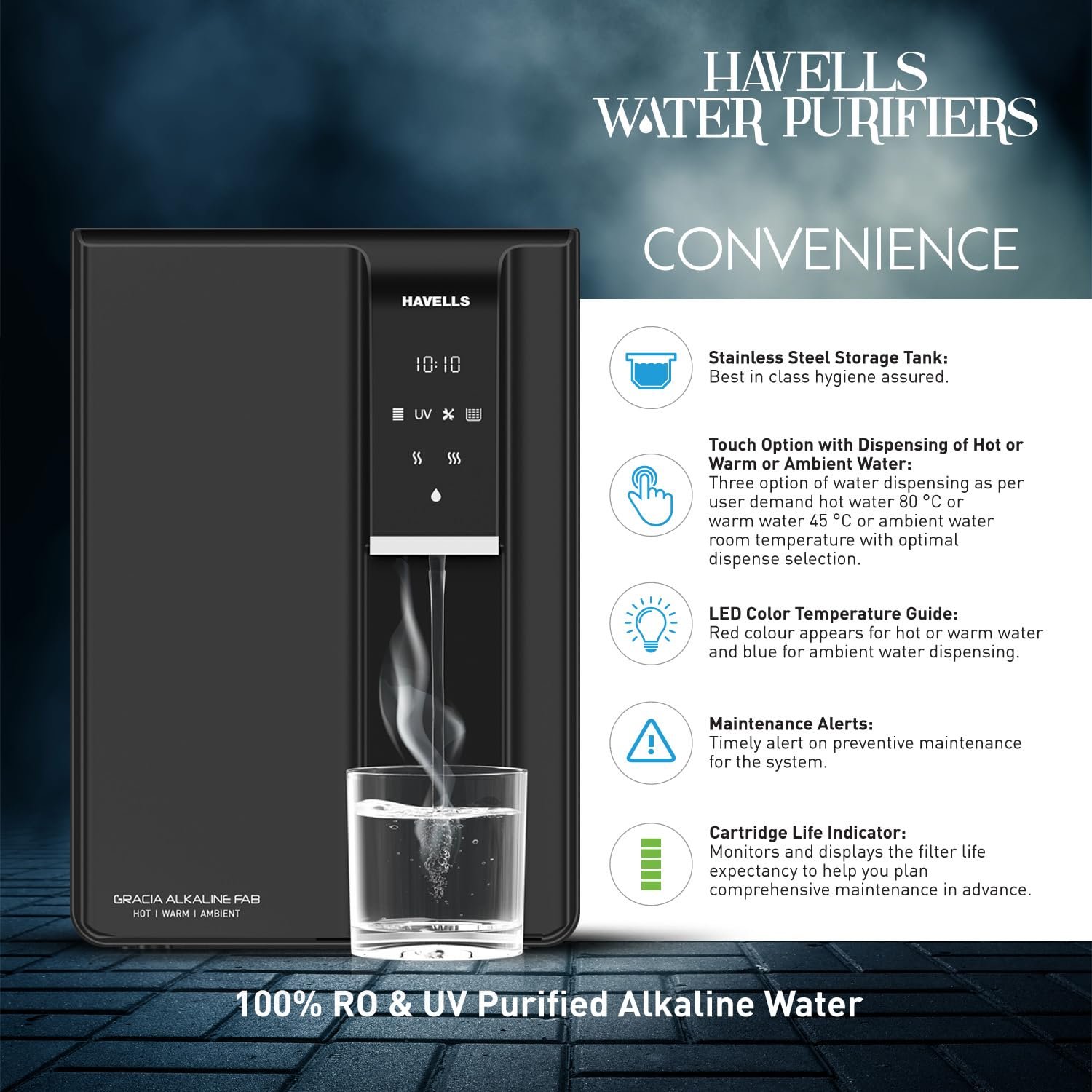 Havells Gracia FAB Alkaline Water Purifier (Black), RO+UV+Alkaline, Hot, Warm & Ambient Water, Copper+Zinc+Minerals, 9 Stage Purification, 6.5L SS Tank, Suitable for Borewell, Tanker & Municipal Water