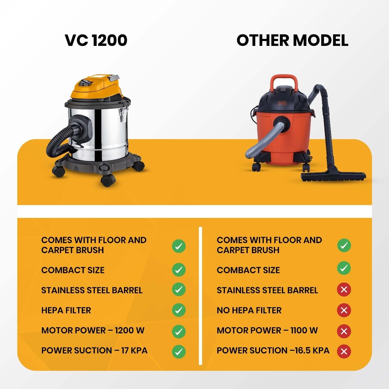 • Complete Set of Vacuum Cleaner Accessories: Comes with hose pipe, 2 extension pipes, floor cum carpet brush, upholstery nozzle, and crevice nozzle, making it a handheld vacuum cleaner that meets all cleaning needs.