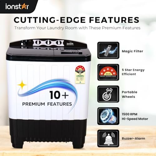 • Ionstar 7.5 Kg Semi Automatic Washing Machine – 5 Star Rated – 2025 – Top Load – Jet Pulsator – Magic Filter – Special Air Dryer – Buzzer – Wheels – Powerful Copper Motor – 1500 RPM (STAR75-AQUA-B)