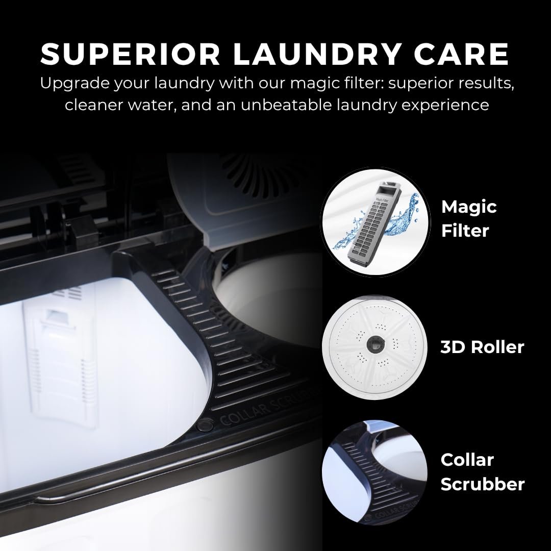 • 10+ PREMIUM FEATURES : Featuring alarm system, portable wheels, Magic Lint Filter, Improvised Collar scrubbers , Elegant Transparent Lid and so much more