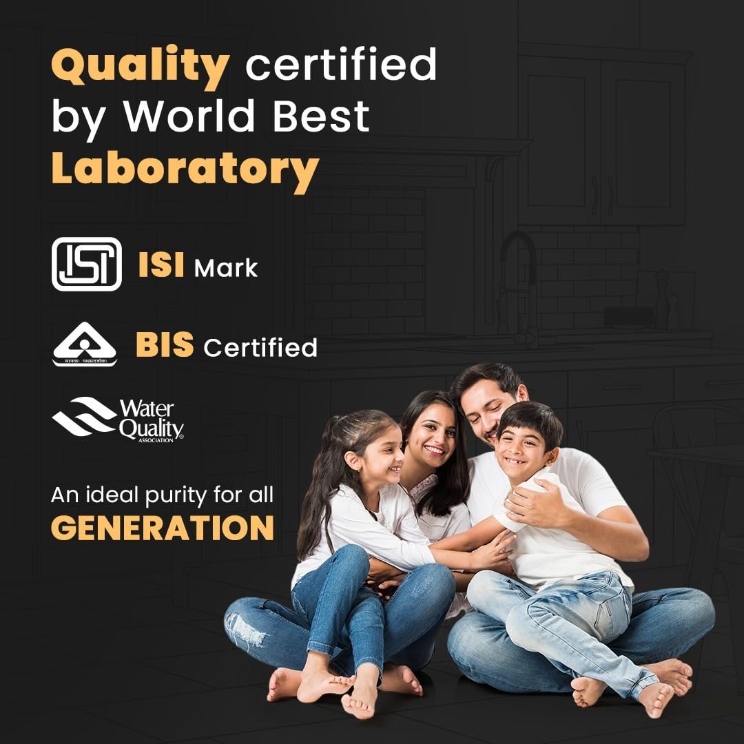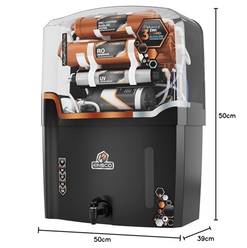 Details: Kinsco Aqua Punch RO UV UF TDS Adjuster Electric Copper Water Purifier contains Sediment Filter, Activated Carbon Membrane: Ro Membrane, UF Membrane, UV Chamber, TDS Adjuster. Pre Filter in Copper RO Filter Purifier removes big particles Impurities from water. Sediment Filter in Copper Water Purifier removes Dust and Sediment Impurities From Water. Carbon Filter in Copper Water Purifier removes Chlorine, Bromine and Odour From Water. Ro Membrane in Copper Water Purifier removes Dissolved Impurities From Water. UF Membrane in Copper Water Purifier removes Bacteria, Cyst From Water. 11 Watt UV Lamp in Copper RO Water Purifier Kills Bacteria And virus from water. This Latest Kinsco Classic Copper Alkaline Water Purifier is best copper water purifier filter & water softener with UV light & 18 L Water Tank along with supreme grade ro motor water booster pump machine (Flow Rate:- 15 L/hr) & Automatic Water Level Sensor Meter.