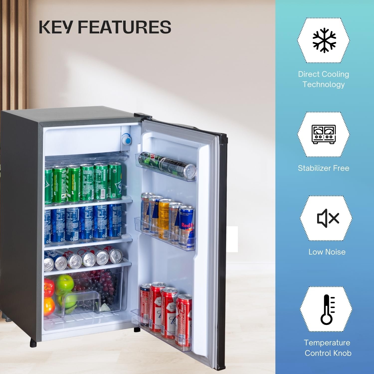 • Compact Size: Its compact dimensions make it ideal for small living spaces, such as studio apartments or dorm rooms. There is no In-Built Light in the fridge.
