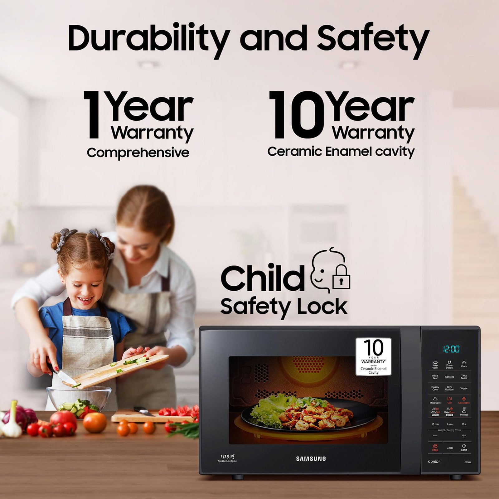 • Manufacturer Warranty: 1 year on product, 10 Years on Ceramic enamel cavity. (T&C Apply) | Enjoy peace of mind with Samsung’s long-lasting ceramic enamel cavity ensuring durability, easy cleaning, and hygienic usage. (Note: Brand Warranty can be availed using seller invoice)