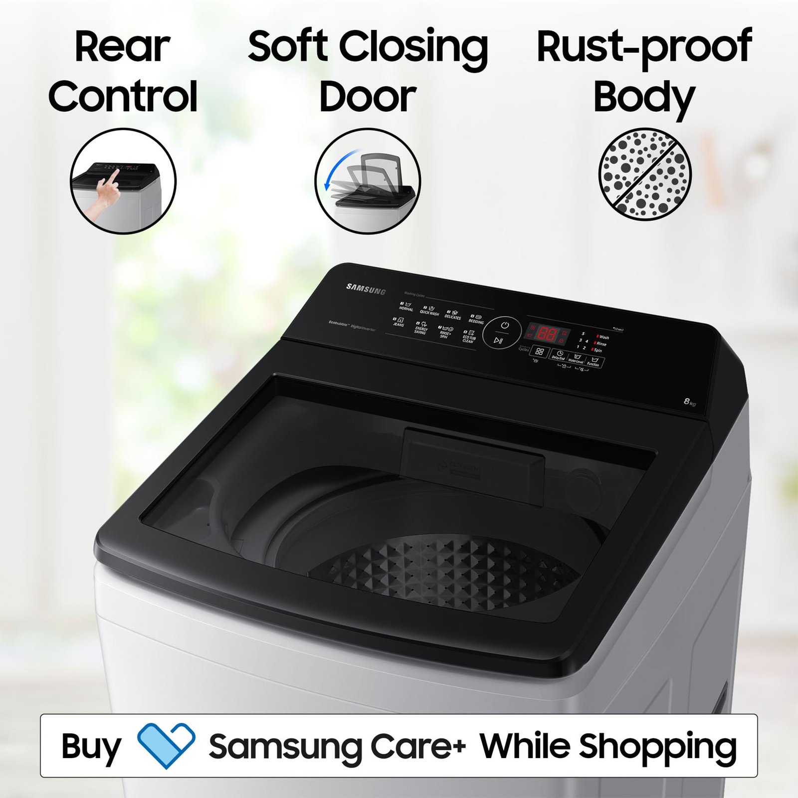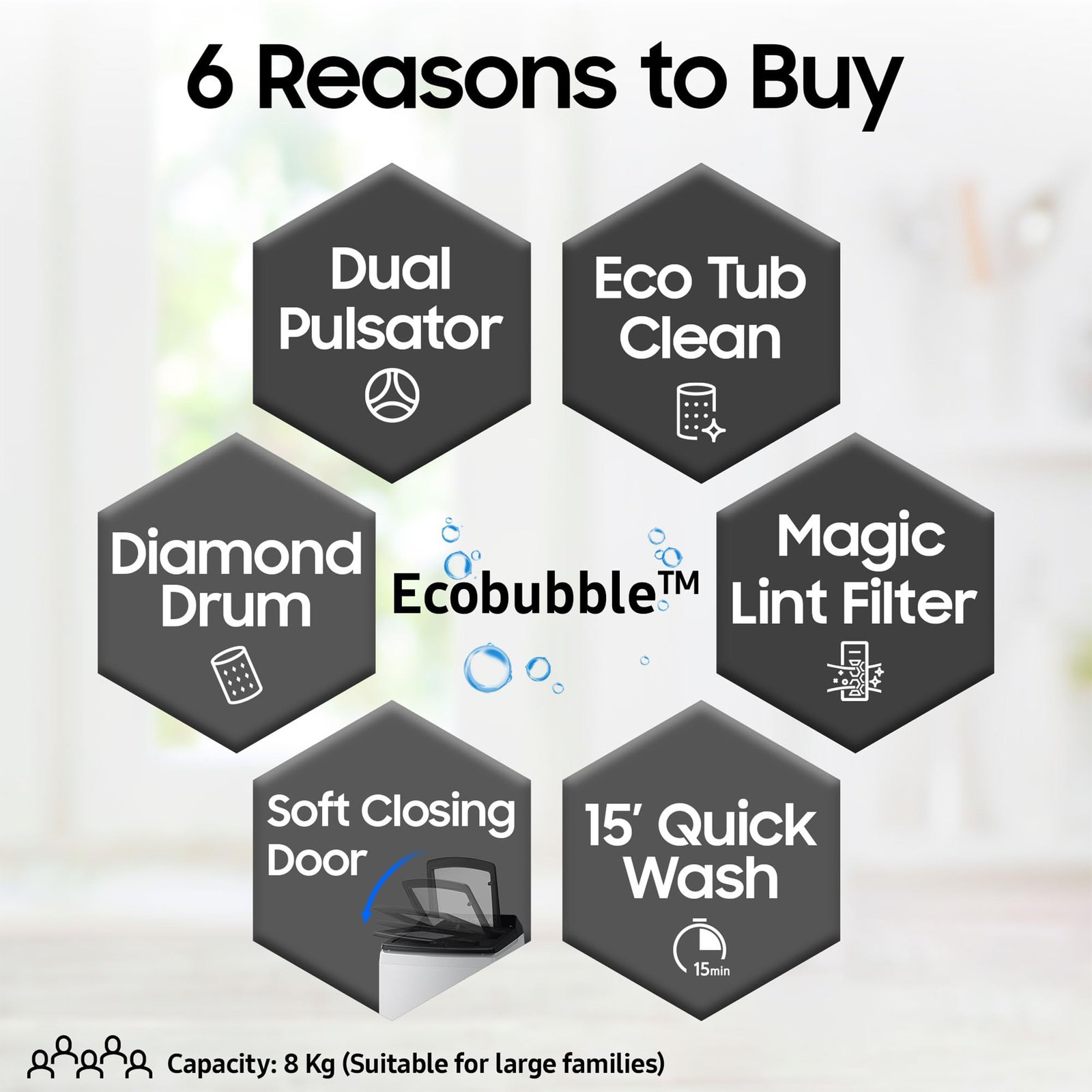 • Samsung 8 kg, 5 star, Eco Bubble Tech, Digital Inverter Motor, Soft Closing Door, Fully-Automatic Top Load Washing Machine (WA80BG4441BGTL, Light Gray)