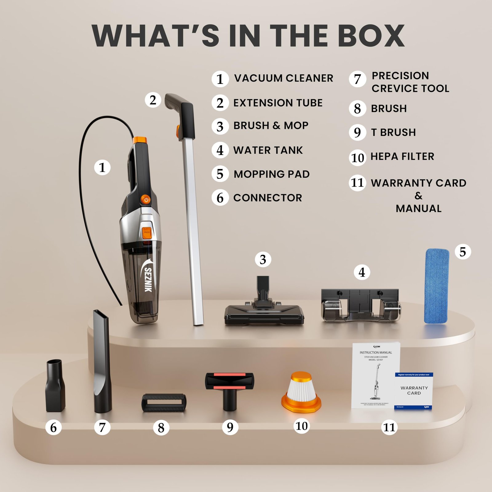 • 𝟐𝟒*𝟕 𝐂𝐔𝐒𝐓𝐎𝐌𝐄𝐑 𝐒𝐔𝐏𝐏𝐎𝐑𝐓, 𝐋𝐈𝐅𝐄𝐓𝐈𝐌𝐄 𝐀𝐒𝐒𝐈𝐒𝐓𝐀𝐍𝐂𝐄 & 𝐖𝐀𝐑𝐑𝐀𝐍𝐓𝐘: Seznik, an Indian brand, offers a 12-month offsite service warranty covering manufacturing defects, with FREE pick-up and drop-off service at your doorstep. Enjoy 24/7 lifetime support from our dedicated team, always ready to assist with any queries or concerns, ensuring uninterrupted peace of mind and satisfaction throughout the life of your Seznik Vacuum Cleaner.