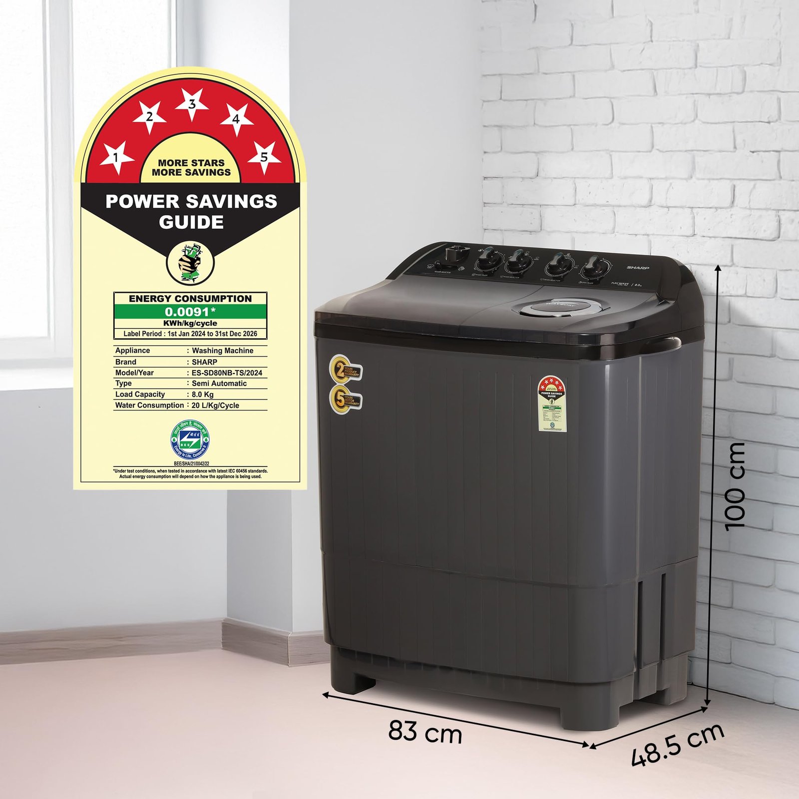 SHARP 8.0 kg, 5 star Semi-Automatic Top Loading Washing Machine with Quadroniq Pulsator, Wave Dry Ring, 300 RPM (ES-SD80NB-TS, Steel Grey, Pure Wave+)
