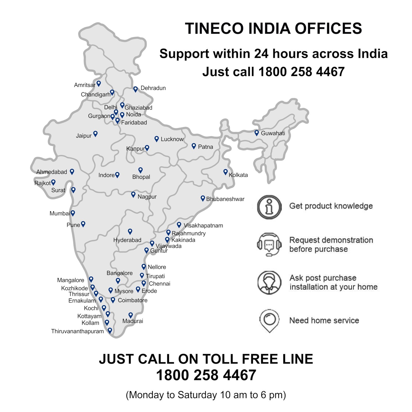• COMPREHENSIVE CUSTOMER SUPPORT: With over 90+ dedicated offices across India, Tineco provides door-step service for all users. We offer free installation and home service, ensuring customer needs are prioritized. Simply reach out via our toll-free number for assistance with demonstrations, installations, and any service requirements.