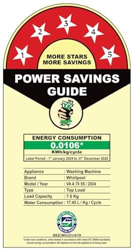 • Energy Rating 5 Star: Best in class efficiency | Energy consumption – 0.0106* KWh/kg/cycle (Please refer BEE label for more information), Model/Year : VA A 70 5S/2024