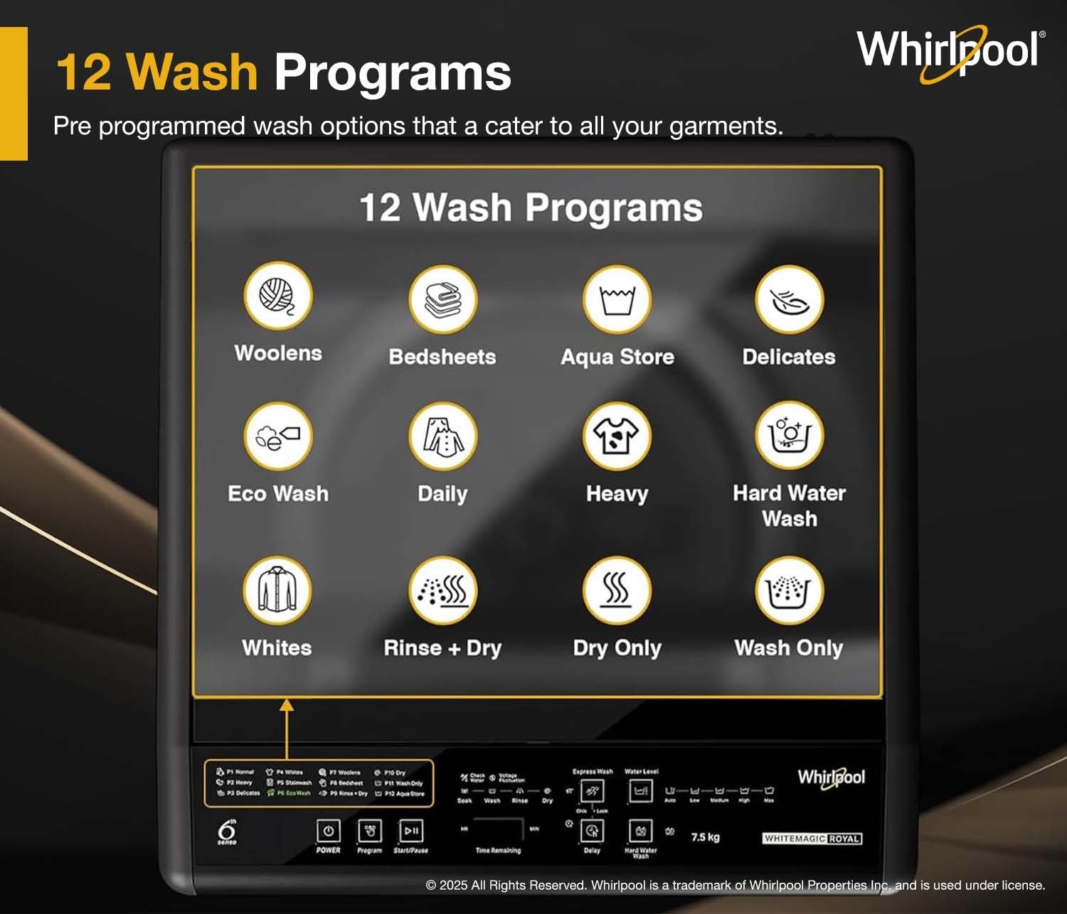 • Wash Programs : 12 Wash Programs – Daily | Heavy | Delicate | Whites | Stainwash | Wash Only | Woollens | Bedsheet | Eco Wash | Rinse + Dry| Dry | Aqua Store