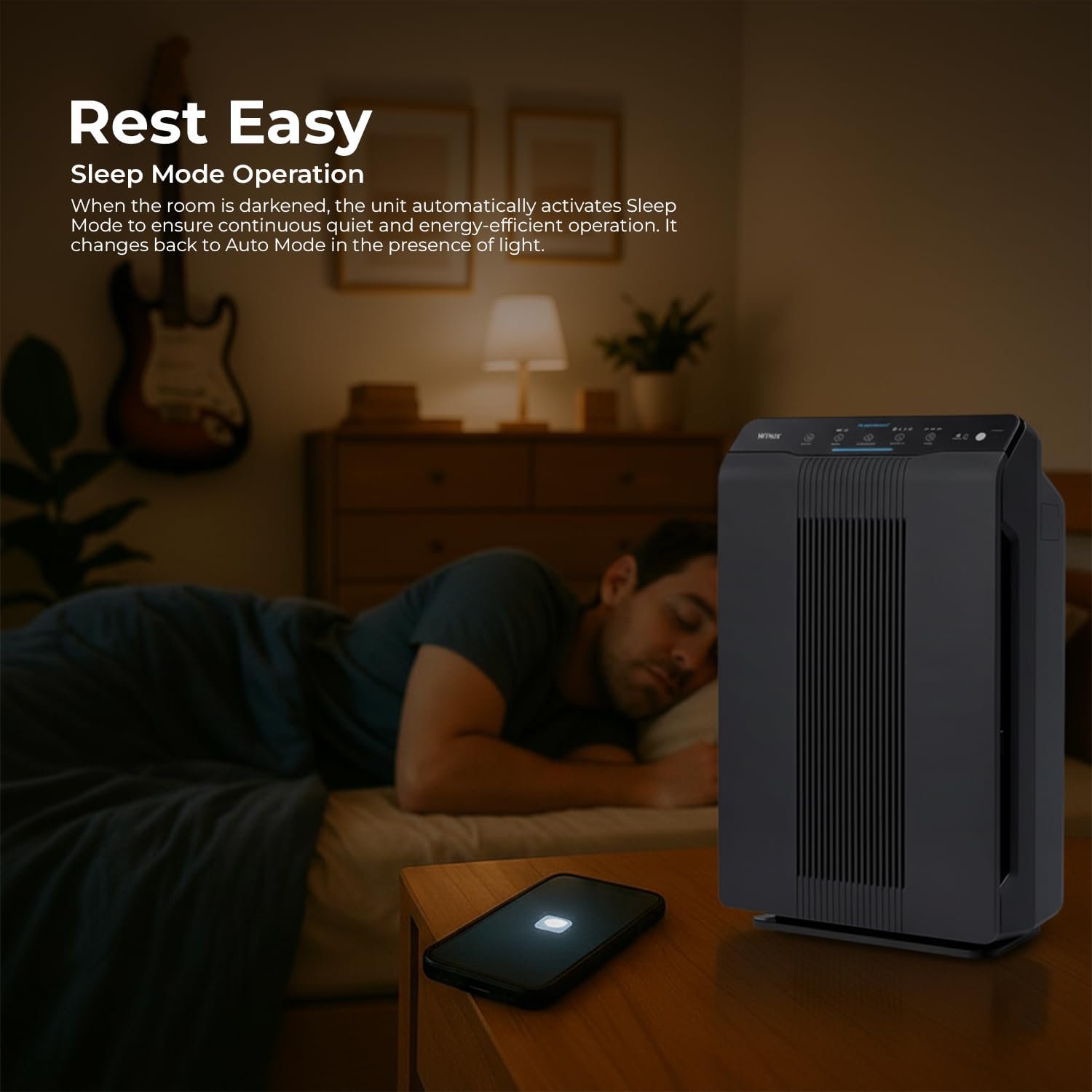 • Smart Sensors gauge the air and our Auto Mode adjusts the fan to filter the air as needed; with a sleep mode for silent night-time operation.